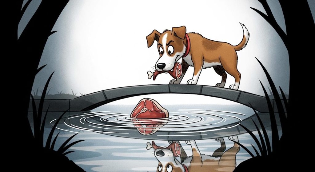 냇가에 엎드려 물을 마시던 개는 문득 물속에 비친 자신의 모습을 보게 되었습니다. 그런데 물속에는 또 다른 개가 커다란 고기 덩어리를 물고 있는 모습이 보이는 것이었습니다. 탐욕스러운 개는 물속에 비친 개가 물고 있는 고기가 자신의 것보다 훨씬 커 보인다고 생각했습니다.