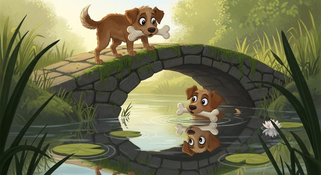냇가 위를 가로지르는 좁은 나무 다리 위에 선 개는 흐르는 물을 내려다보았습니다. 그런데 놀랍게도 물속에 또 다른 고기가 보이는 것이었습니다. 개는 물에 비친 자신의 모습은 생각지도 못하고, 다른 개가 고기를 물고 있는 줄로 착각했습니다.