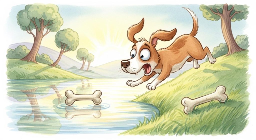 탐욕스러운 개는 물속에 비친 또 다른 고깃덩어리를 보자 갑자기 엄청난 욕심이 생겼습니다. ‘만약 저 고기까지 내가 차지한다면 얼마나 좋을까?’ 개는 속으로 생각했습니다. 그는 물속의 개가 들고 있는 고기까지 빼앗을 심산으로 짖어대며 달려들었습니다.