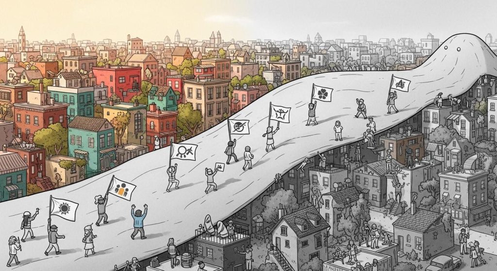 모스코위츠는 도시 개발이 단순히 경제 성장의 동력으로 작동하는 것이 아니라, 제국주의 시대의 착취적 모델을 답습하고 있다고 주장합니다. 과거 제국주의 국가들이 식민지에서 자원을 약탈하고 경제적 이익을 취했던 것처럼, 현대의 신자유주의 도시정책은 소외된 계층의 삶의 터전을 파괴하고, 그 자리에 자본의 논리에 맞는 공간을 창출합니다. 이는 곧 도시를 살아있는 공동체가 아닌, 투기의 대상으로 전락시키는 결과를 낳습니다.