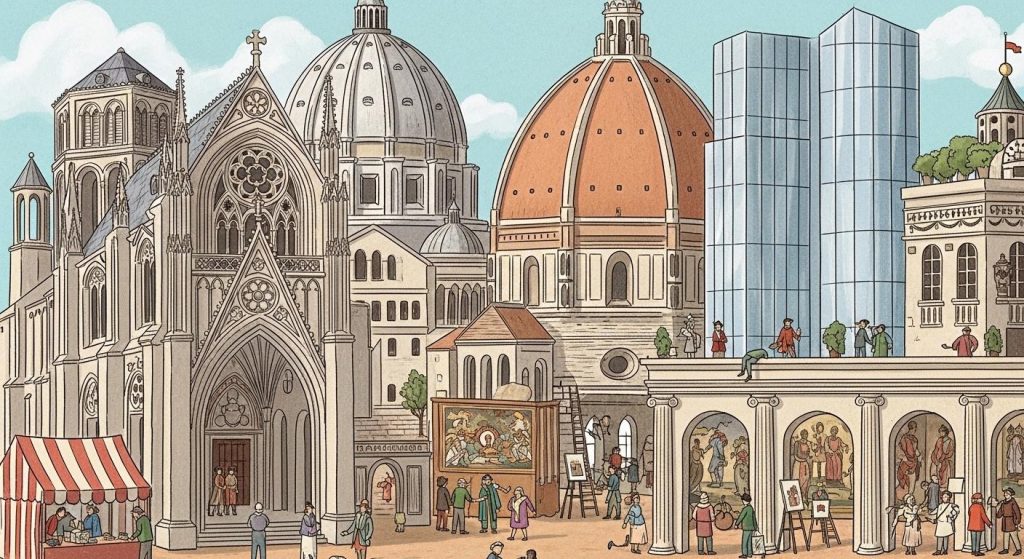 책은 건축을 ‘사람이 사용하는 공간을 만드는 것’이라는 기본적인 정의에서 시작한다. 석기 시대의 단순한 구조물부터 시작해 이집트의 룩소르 신전, 그리스의 파르테논 신전, 로마의 판테온과 콜로세움 등 고대 건축물은 권력과 종교의 상징으로서 시대적 가치관을 반영한다. 특히 기독교 교회 건축의 발전은 중세 유럽 사회의 중심축으로서의 역할을 보여준다. 로마네스크 양식에서 고딕 양식으로의 변화는 두꺼운 벽을 넘어 빛을 활용한 공간 창조를 통해 신에 대한 경외심을 극대화하려는 노력을 엿볼 수 있다.